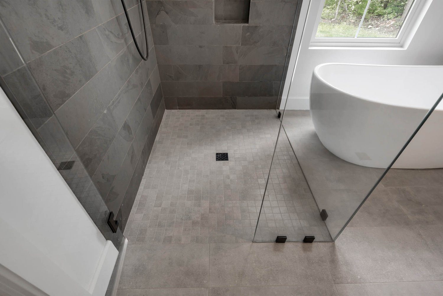 Flush entry shower in a Nemo tile concrete look and slate walls. Cabinets in Sherwin Williams Iron Ore.