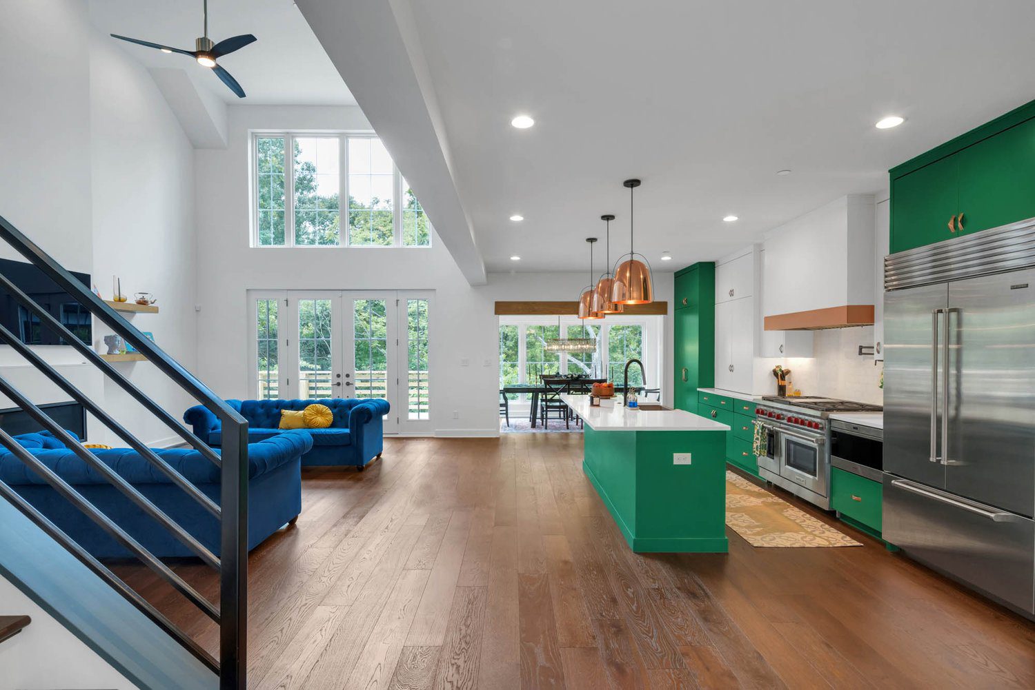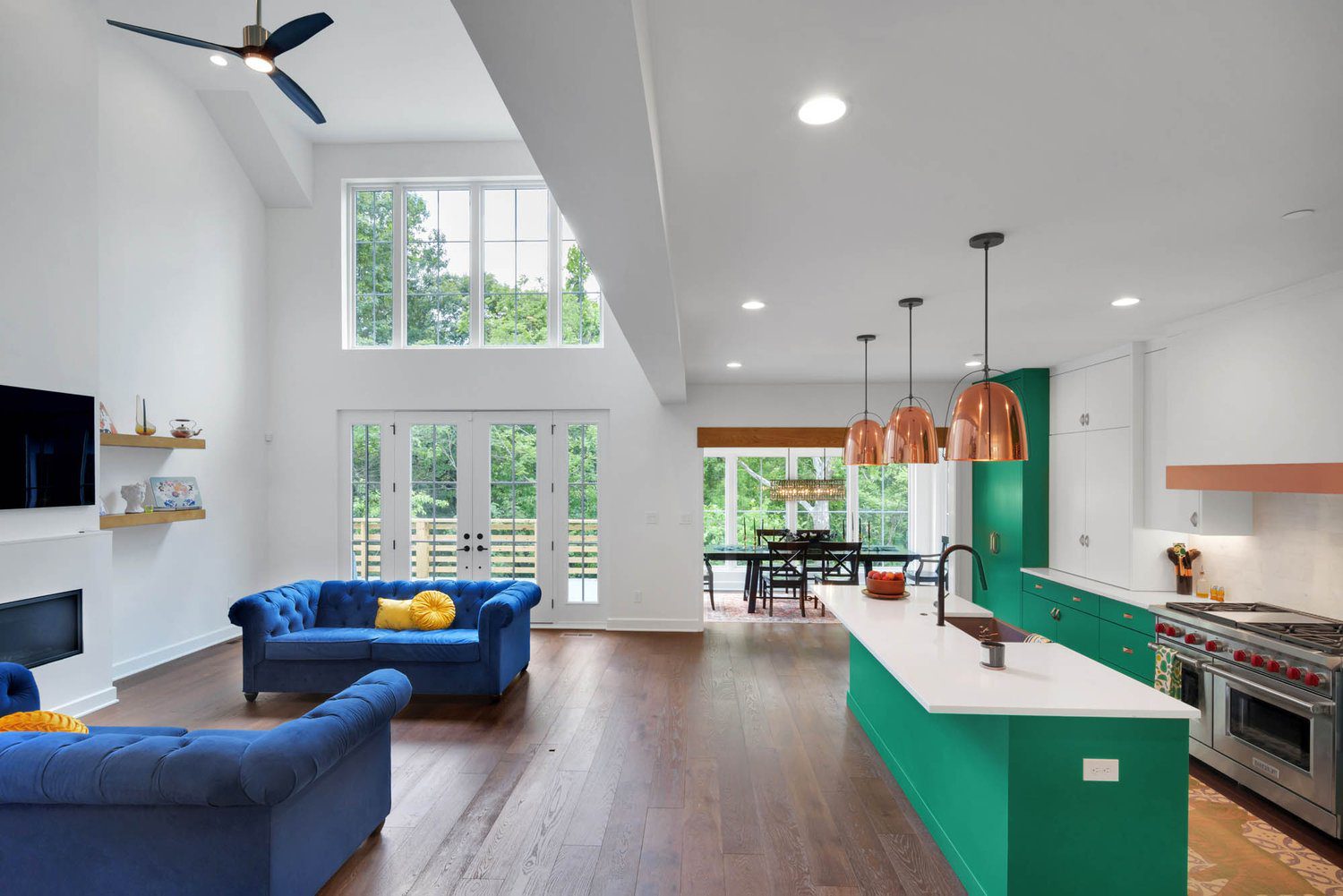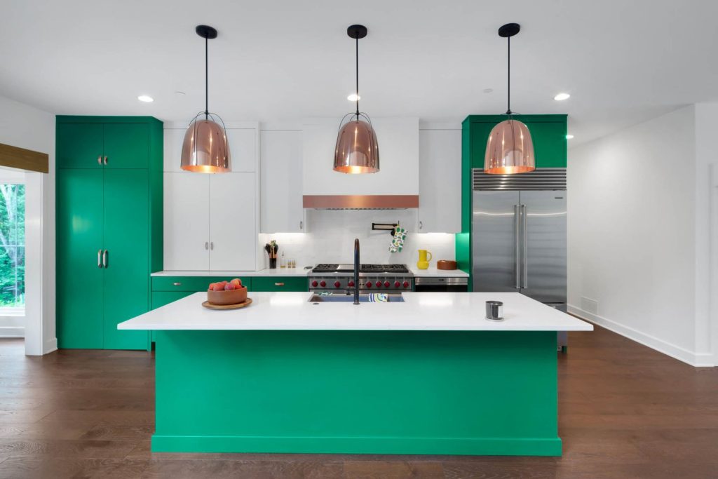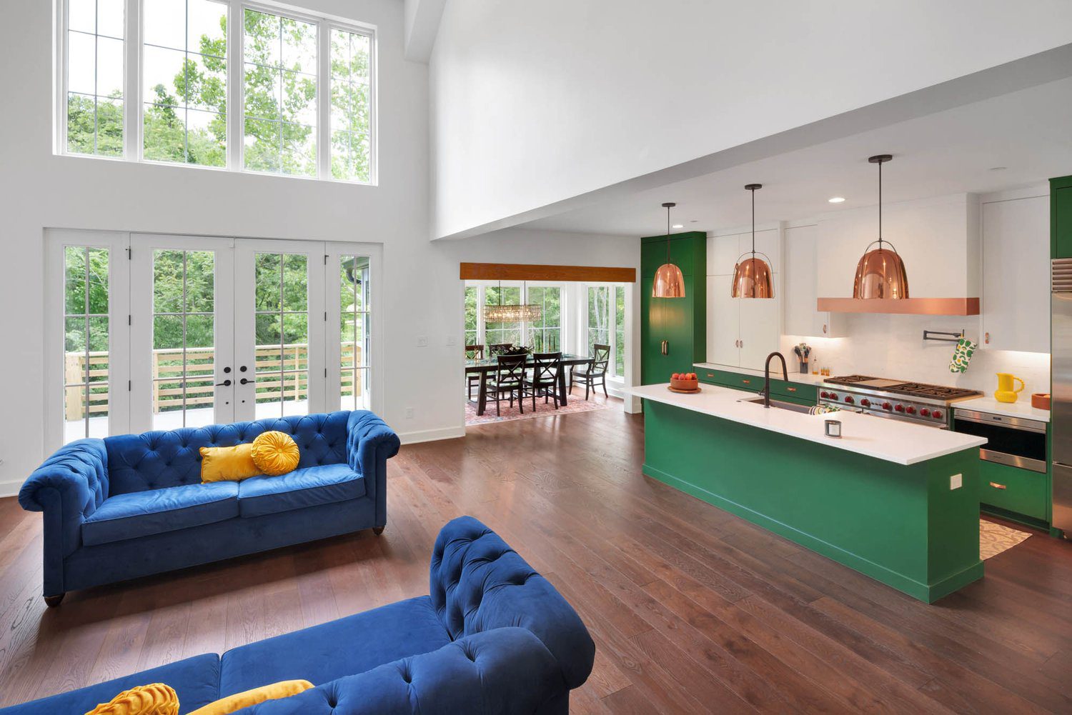 Kitchen with green island, white countertop, and copper pendant lights, overlooking dining space and lush outdoor greenery.