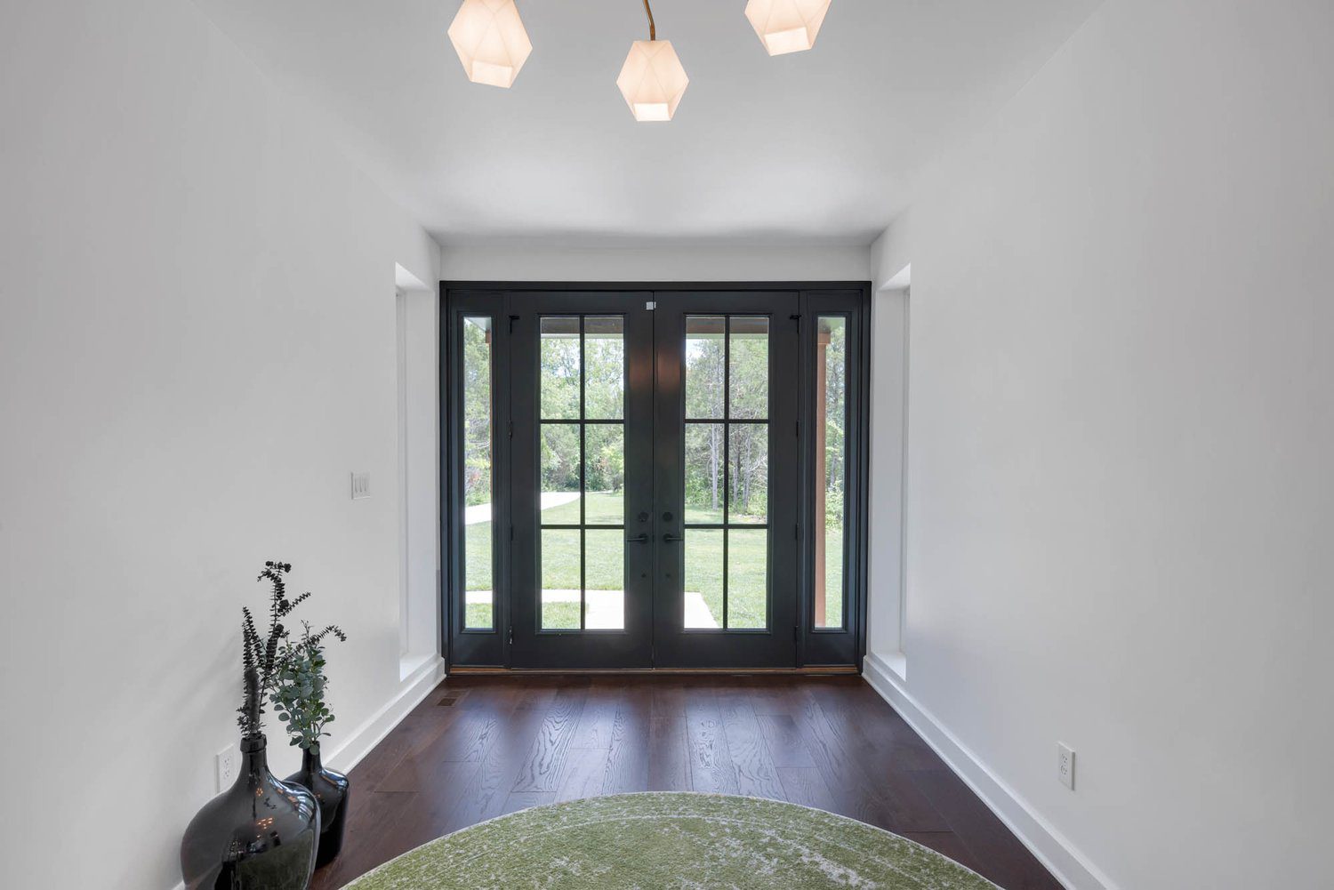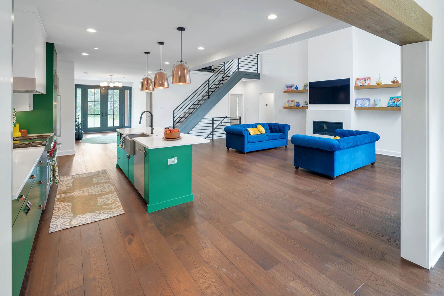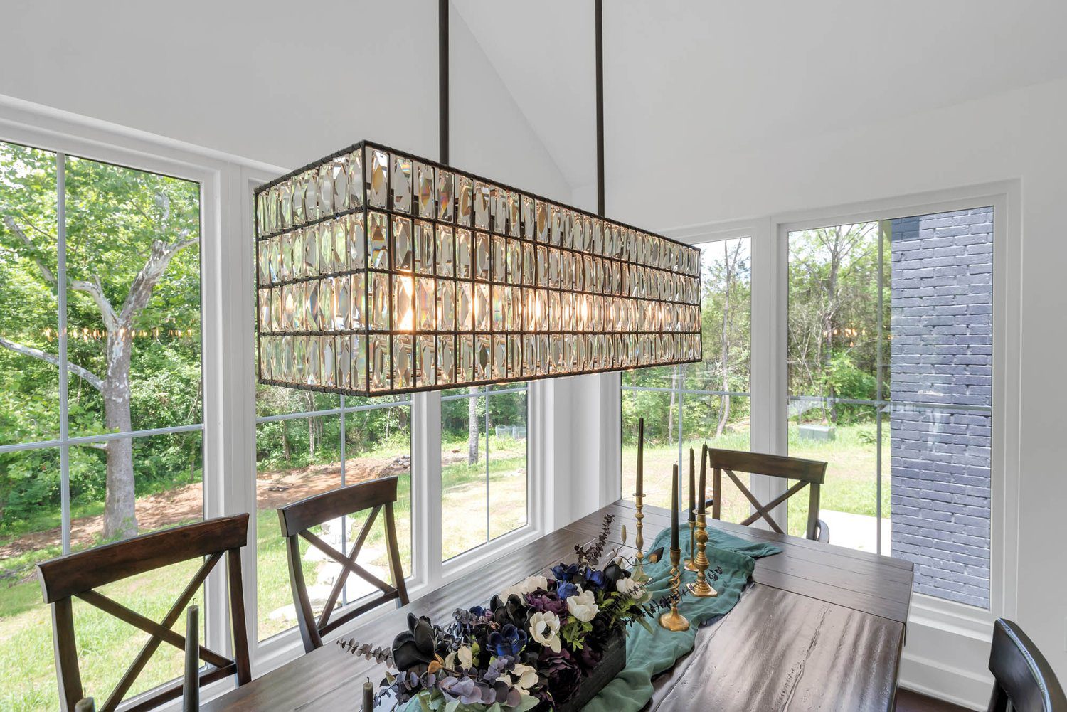 Kitchen with green island, white countertop, and copper pendant lights, overlooking dining space and lush outdoor greenery.