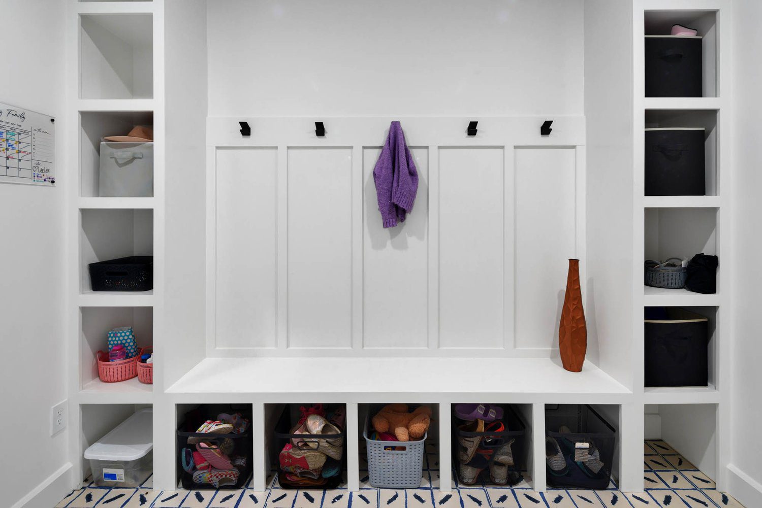 Children’s playroom with pastel walls, wood floors, cozy nook doors, and built-in storage cubbies holding toys and colorful bins.