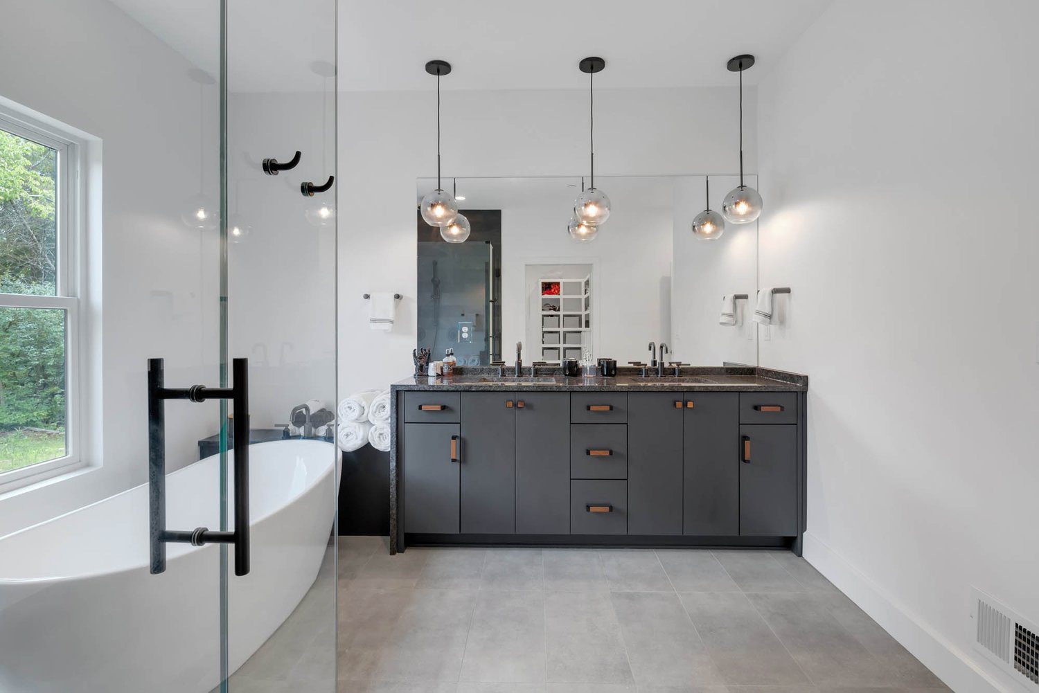 Bathroom with black vanity, pendant lights, large mirrors, walk-in shower, and freestanding tub by window in a minimalist style.